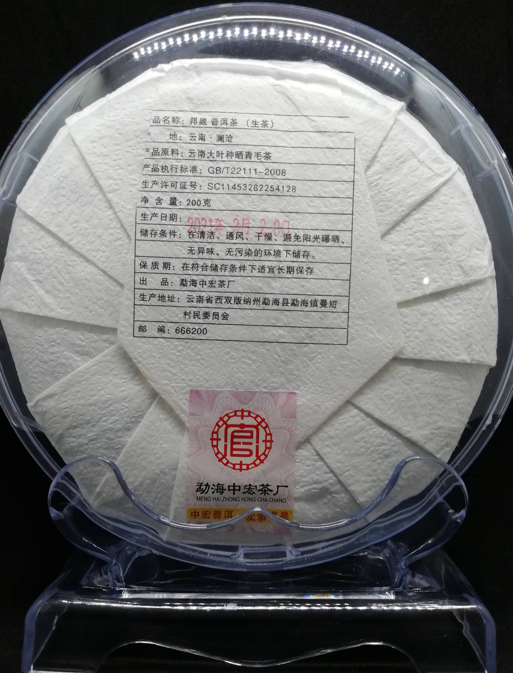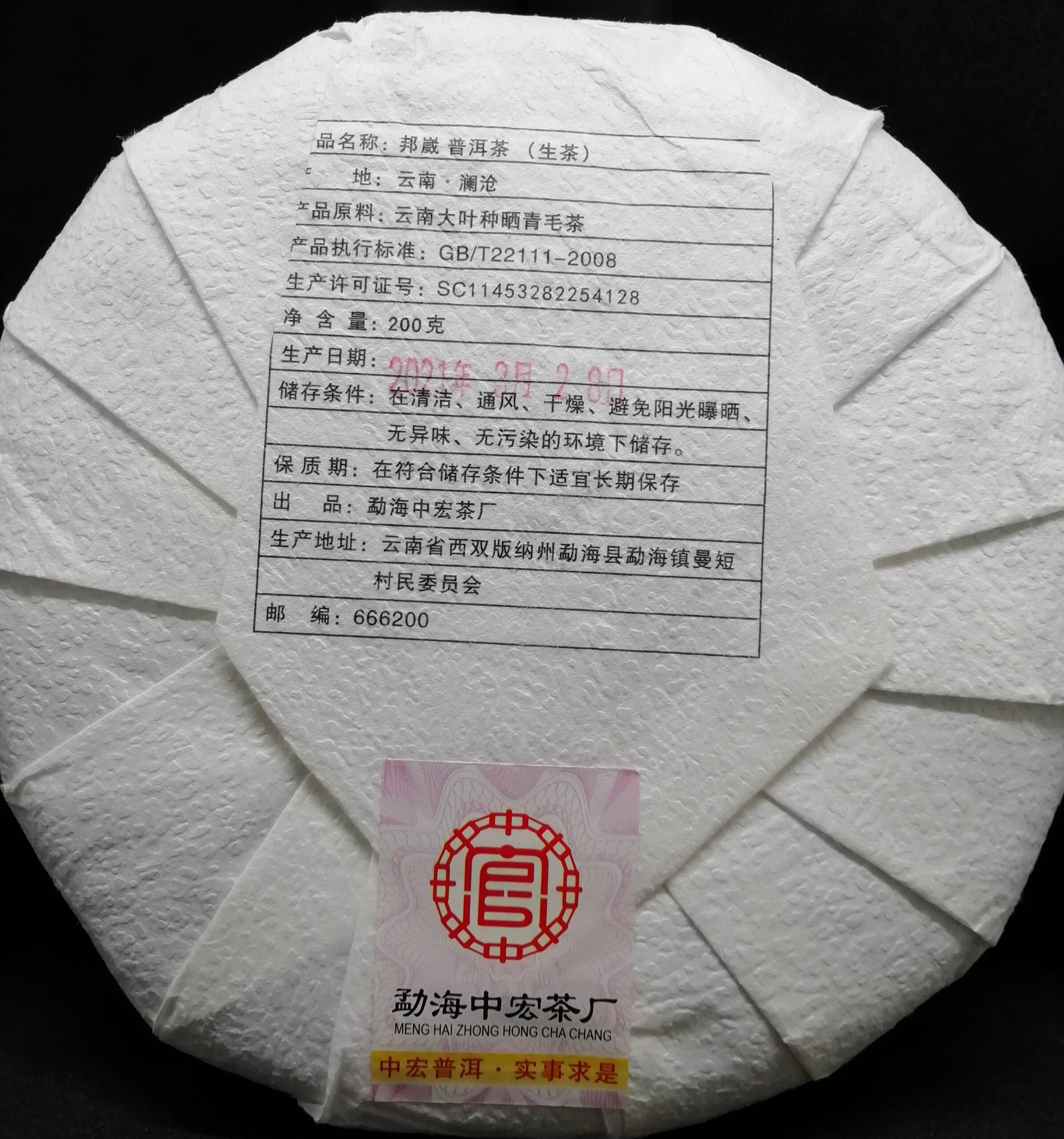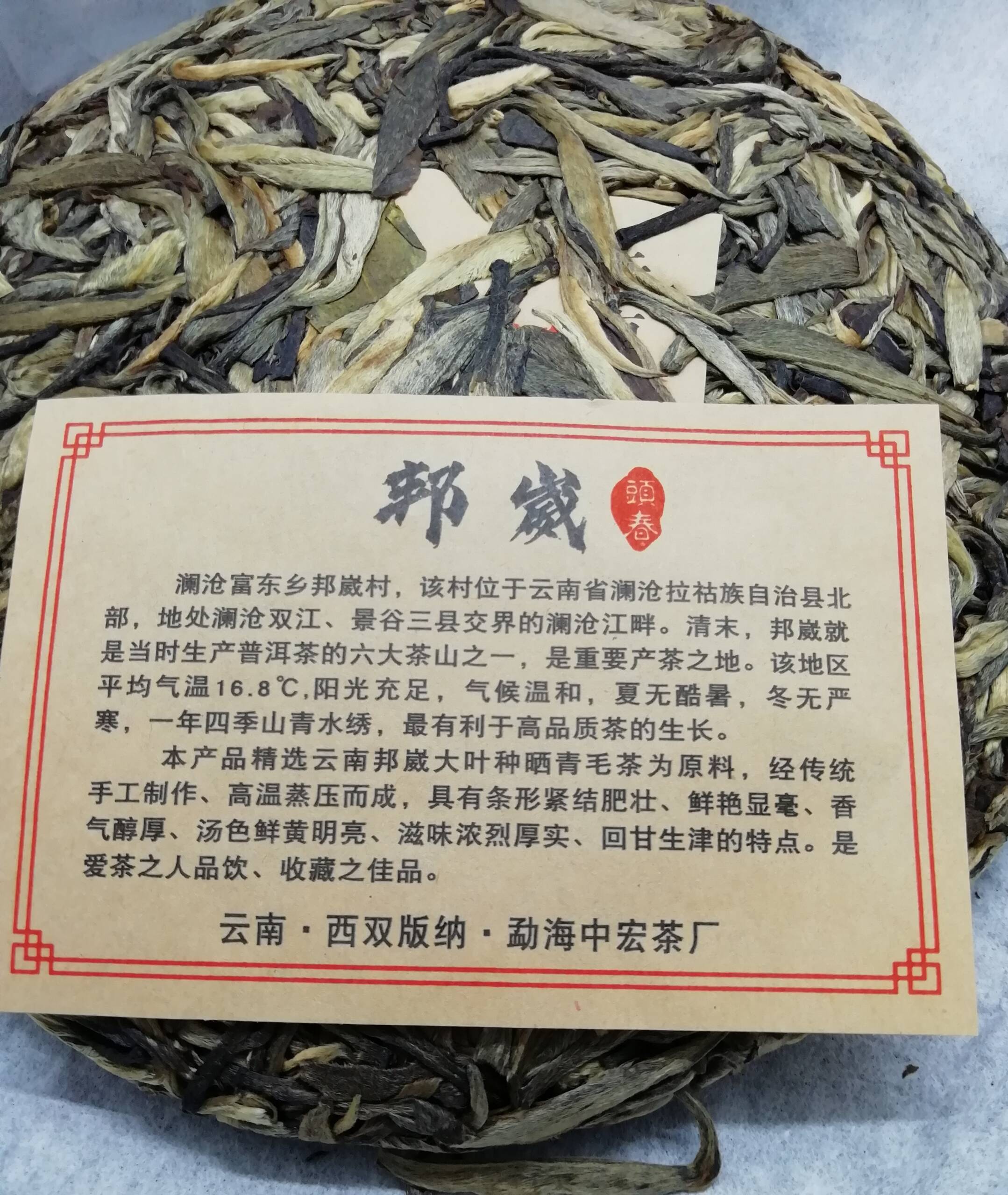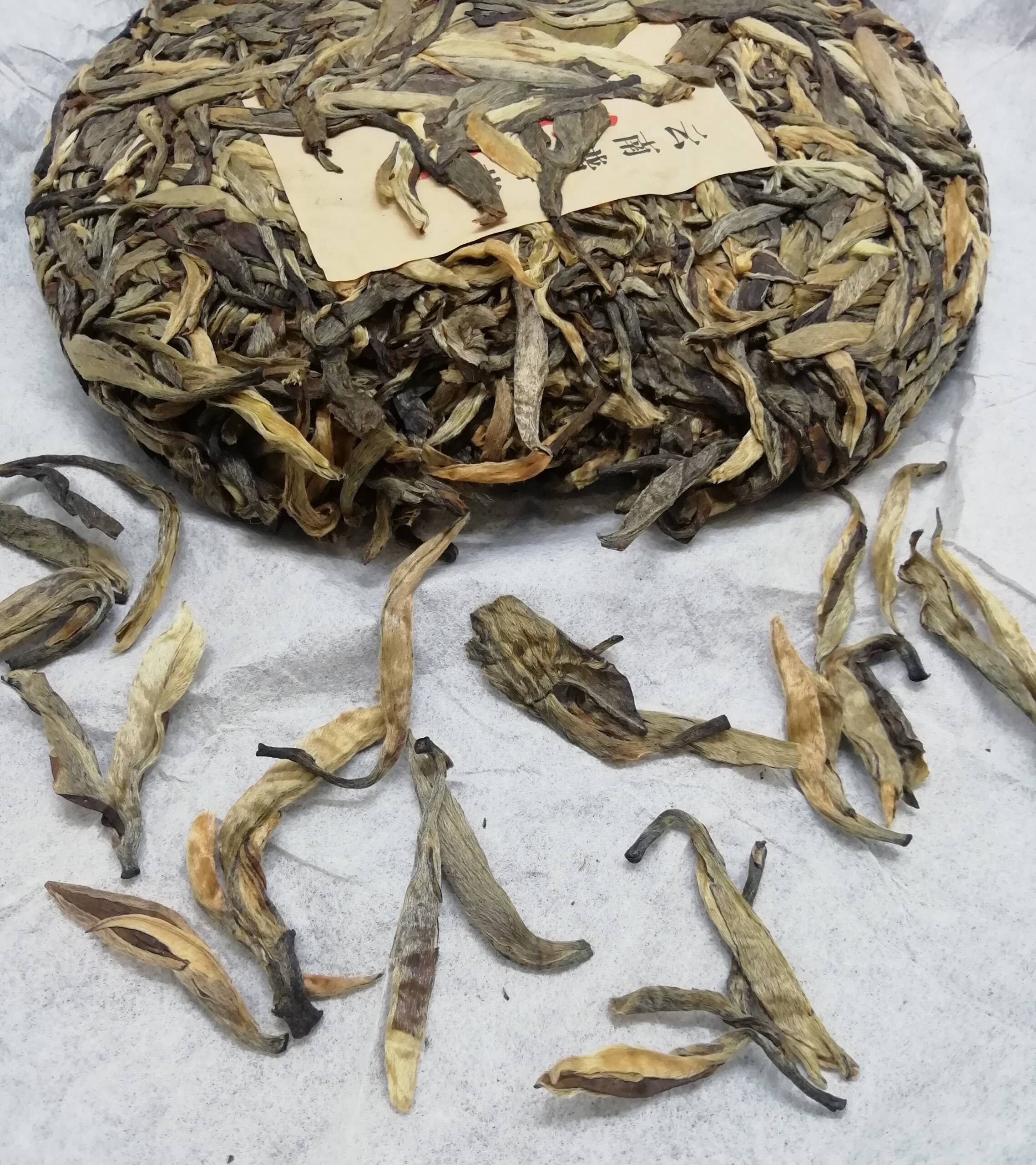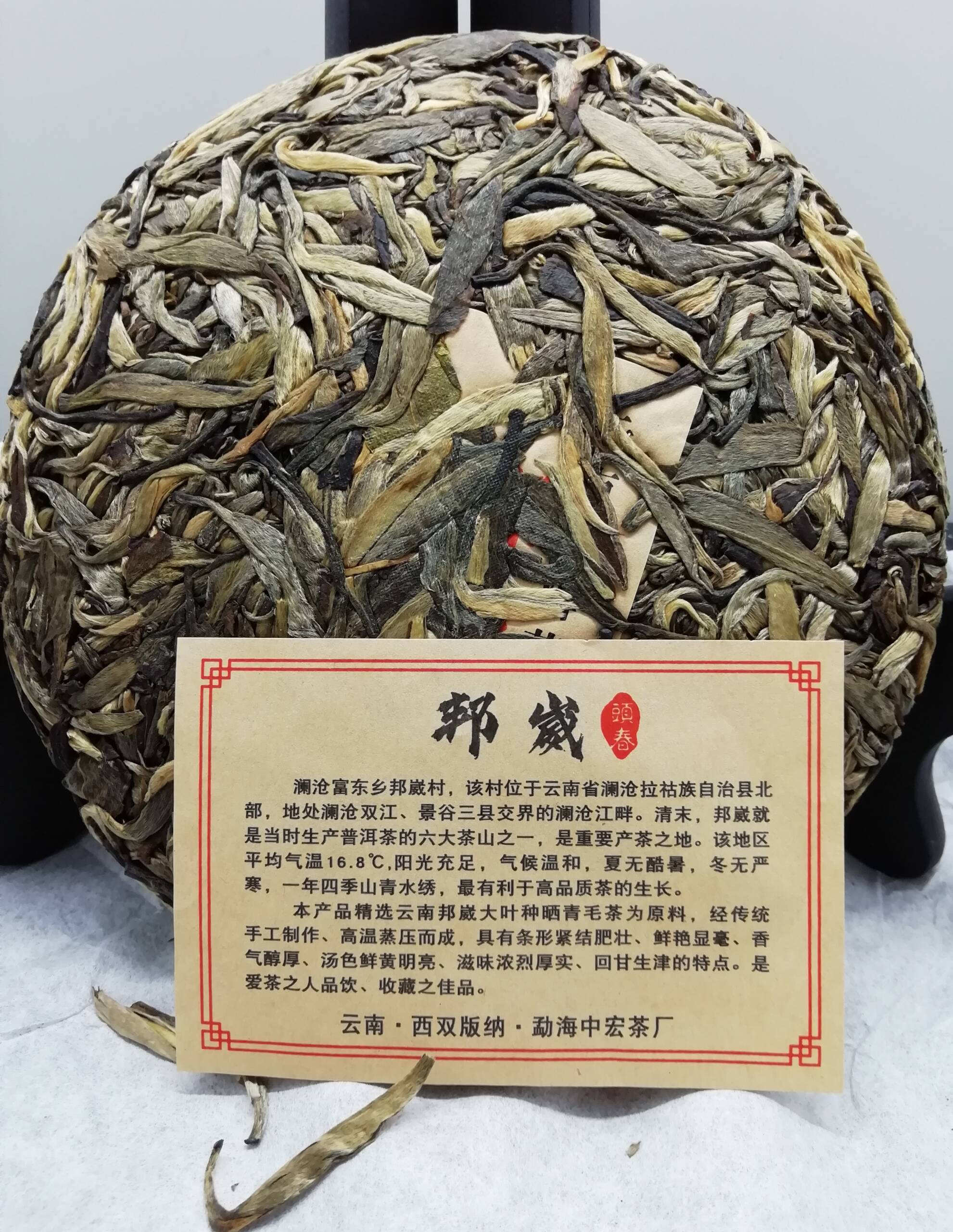 Оригинальный и уникальный китайский чай Шен пуэр Старое Дерево Бангвей Менхайской чайной фабрики (Zhonghong Tea Factory) из сырья деревни Бангвей провинции Линьцан 2021 года, первого весеннего сбора сырьё высшей пробы, состоящий преимущественно из золотистых почек старых 900 летних деревьев высушенных на солнце традиционным способом.